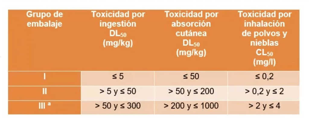 Clasificación de tóxicos de la clase 6.1 del ADR, según su toxicidad